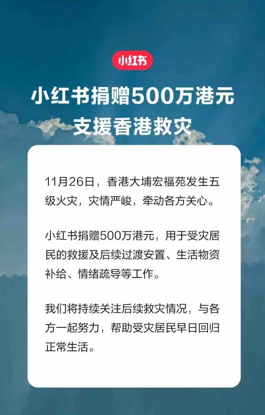 11月27日,小红书宣布捐款500万港元,用于香港大埔受火灾影响居民的救援及后续安置过渡、日常物资补给以及情绪疏导等。 26日,香港大埔宏福苑发生火灾。灾情严重,引起各方关注。小红书表示,将持续关注后续救灾情况,并与各方合作,帮助受灾居民尽快恢复正常生活。